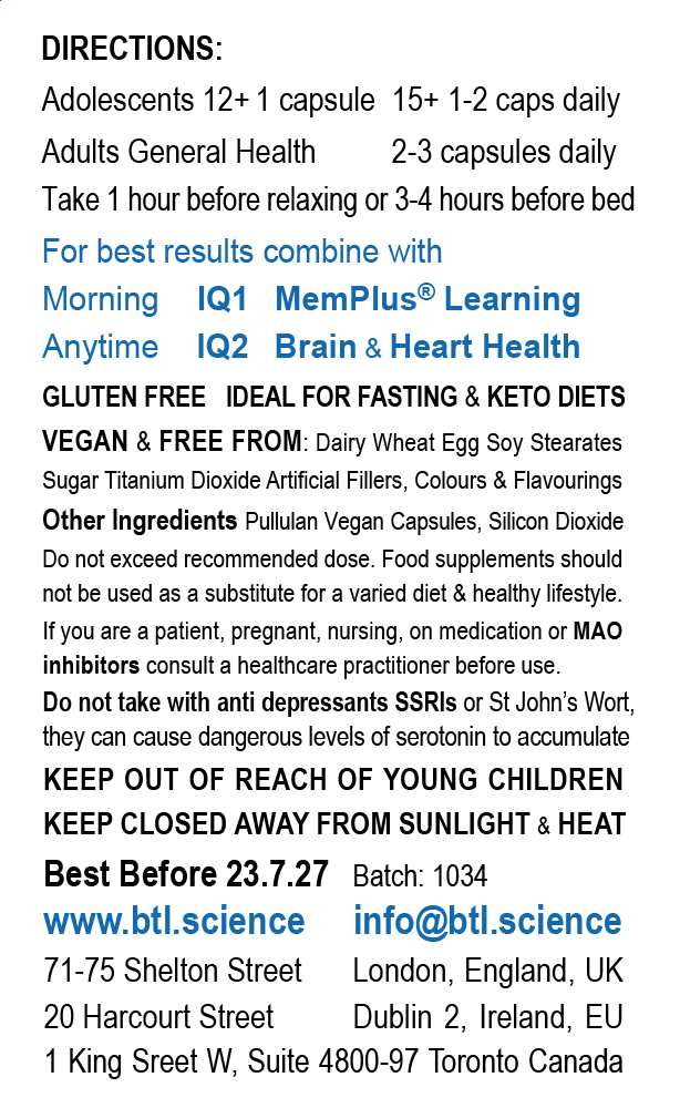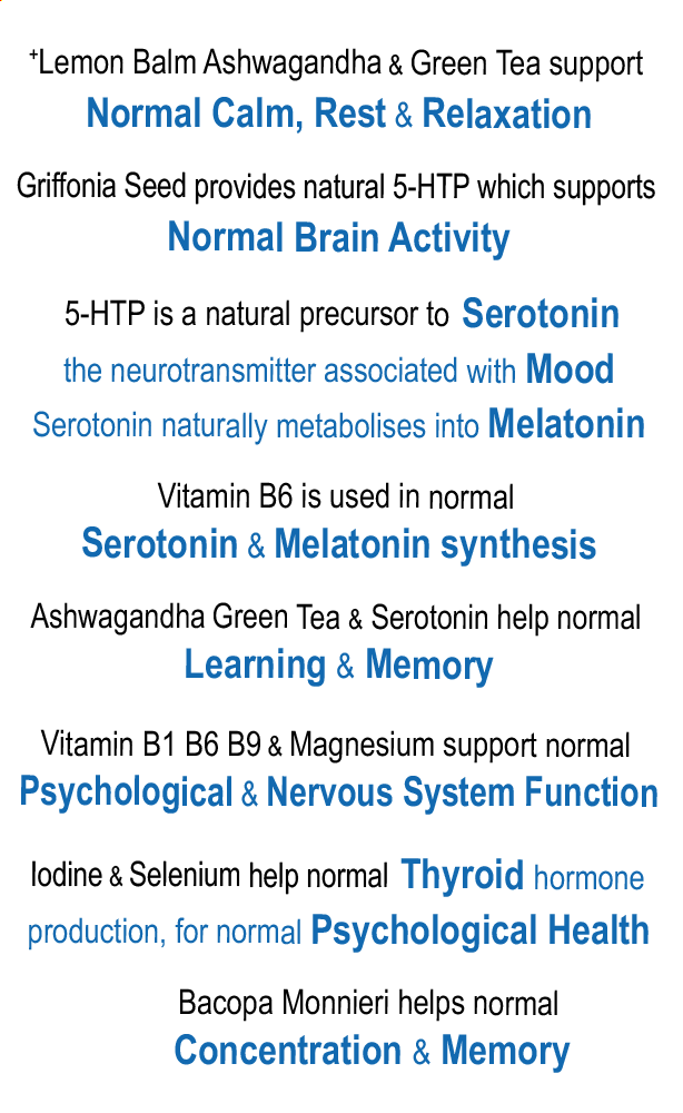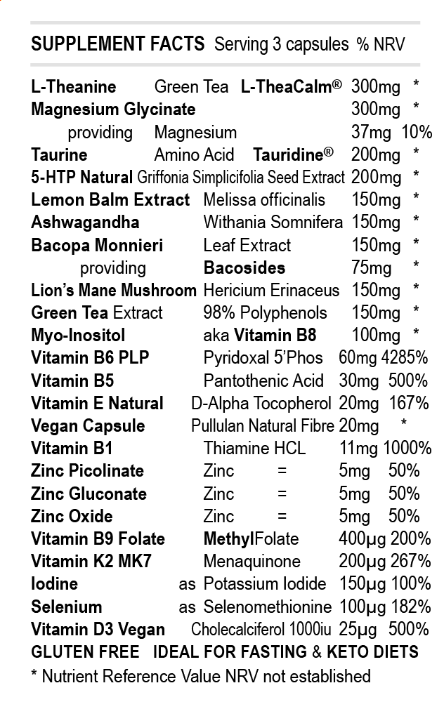 Ashwagandha, Lemon Balm, 5-HTP, L-Theanine and Magnesium are vital ingredients.